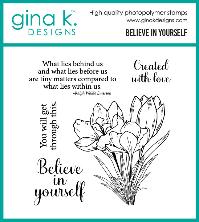 Believe in Yourself is a stamp set by Gina K Designs. This set is made of premium clear photopolymer and measures 4" X 4". Made in the USA