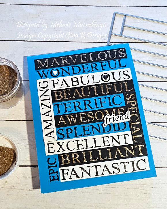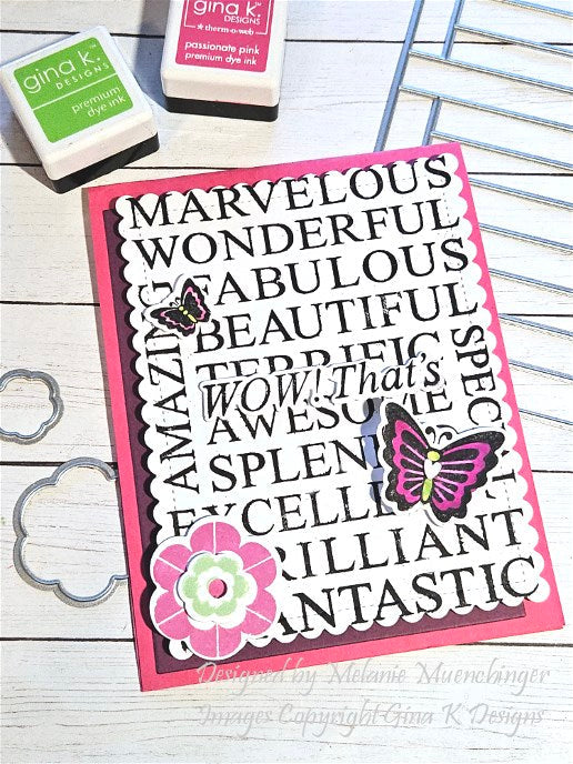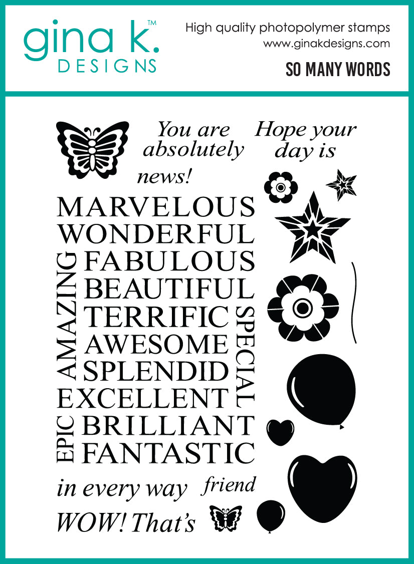 You are going to fall in love and never be at a loss for words with Melanie Muenchinger's new set So Many Words! Featuring a large background stamp made up of 13 bold adjectives that work for so many occasions and fits A2 and A7 cards, this set is perfect for so many inky techniques and one you'll reach for again. S3t includes coordinating sentiments to enhance the background stamp, plus themed images like balloons, hearts, stars, flowers and butterflies for birthdays, showers, and so much more! Background stamp layers onto the rectangular Master Layouts 1 dies and the coordinating So Many Words die set cuts out all words in the background stamp at once to use on different projects as well as the other images and sentiments. 18 stamps
