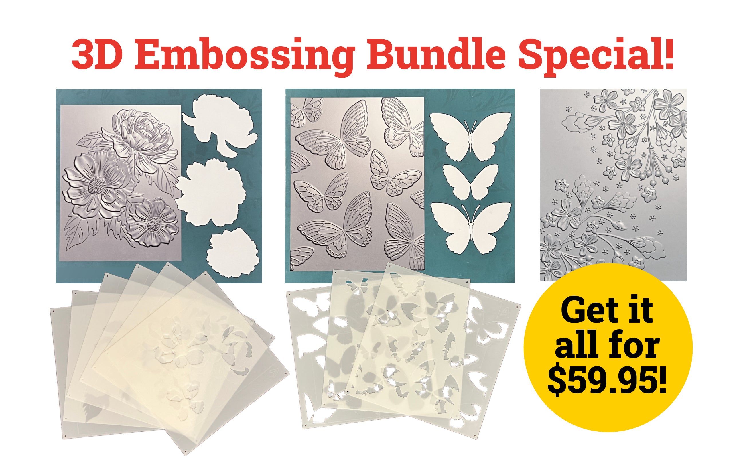 You get three brand new 3D Embossing Folders, two sets of coordinating layering stencils, two die sets and one Background Embossing Folder! This is a $78.85 value, and it's yours for only $59.95!