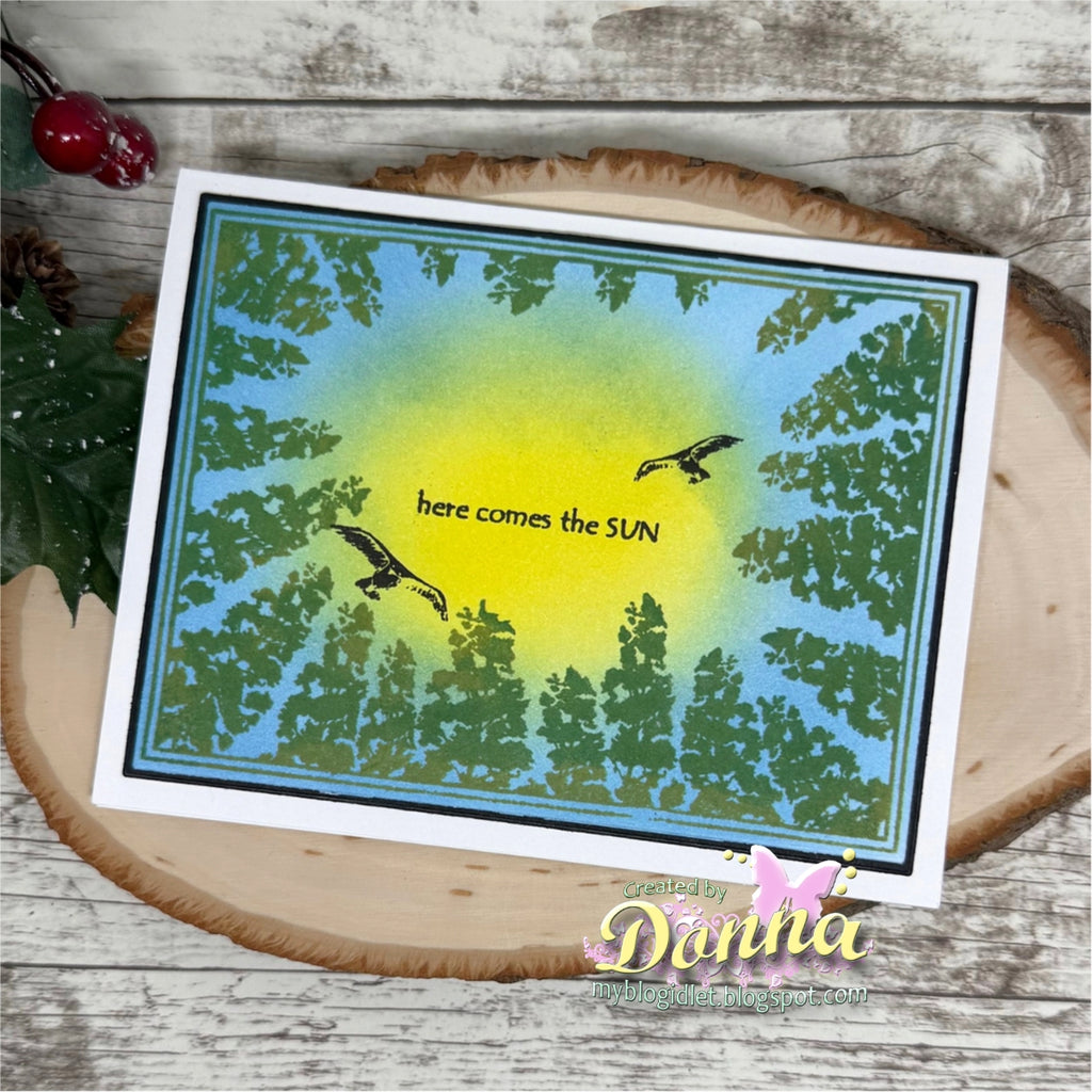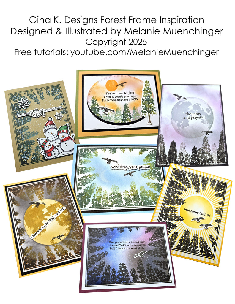 Forest Frame is the newest nature set from artist Melanie Muenchinger. The frame with its beautiful trees works both portrait and landscape style on A2 and 5x7 cards. The set is perfect for any season or occasion, masculine designs and all your background blending and inky techniques. You’ll have fun customizing the frame’s center with the birds, sentiments, scriptures and sun and moon. Use the coordinating elements without the frame for clean and simple designs. The encouraging sayings and verses are sure to lift anyone’s spirits. Frame measures 3 5/8” x4 7/8” and fits the Master Layouts 1 and 14 die sets. Coordinating die set to cut all the remaining images and sentiments available. Ten greetings and 7 images for a total of 17 stamps.